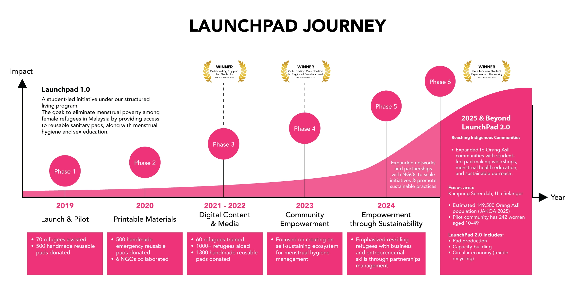 As UNICEF reports, "Refugee and stateless girls are especially at risk of poor menstrual hygiene due to lack of access to clean water, privacy, and sanitary products" (2022). These challenges similarly affect Orang Asli communities, making LaunchPad 2.0 a crucial extension of our mission.