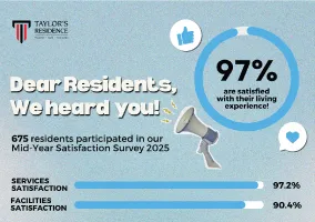 Thank you to the 675 residents who took part in our Mid-Year Satisfaction Survey 2025! 💙 We’re happy to share that 97% of you are satisfied with your living experience at Taylor’s Residence.