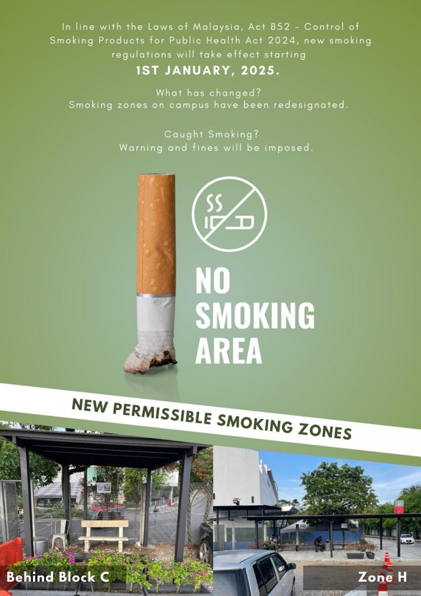 In compliance with Malaysia’s Act 852 – Control of Smoking Products for Public Health Act 2024, new smoking regulations will take effect on 1st January 2025. These regulations are designed to promote a healthier and safer environment for all students, staff, residents, and visitors of Taylor's Lakeside Campus, including patrons of Syopz Mall.